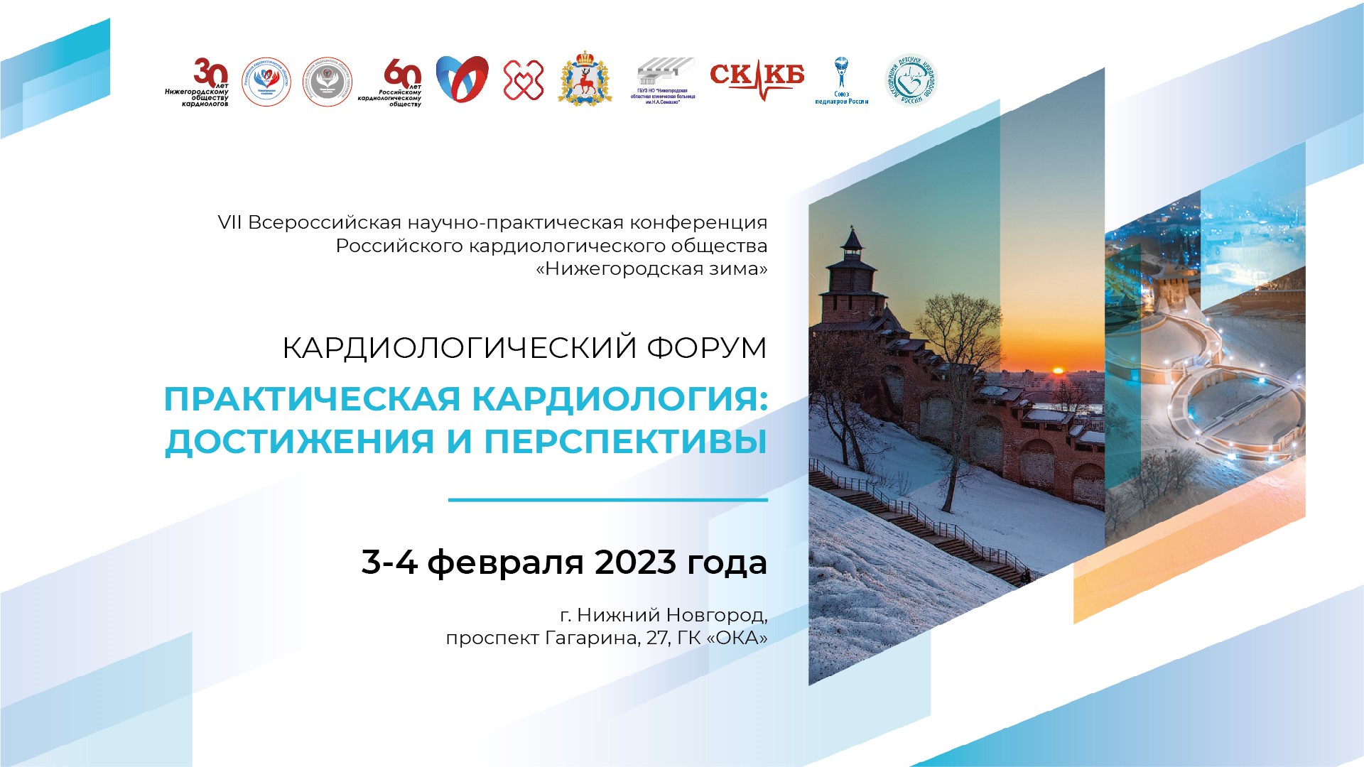 Приглашаем вас принять участие в VII Всероссийской научно-практической конференции Российского кардиологического общества «Нижегородская зима» КАРДИОЛОГИЧЕСКИЙ ФОРУМ «ПРАКТИЧЕСКАЯ КАРДИОЛОГИЯ: ДОСТИЖЕНИЯ И ПЕРСПЕКТИВЫ», которая состоится 03-04 февраля 2023 года по адресу: город Нижний Новгород, проспект Гагарина, 27, ГК «ОКА».