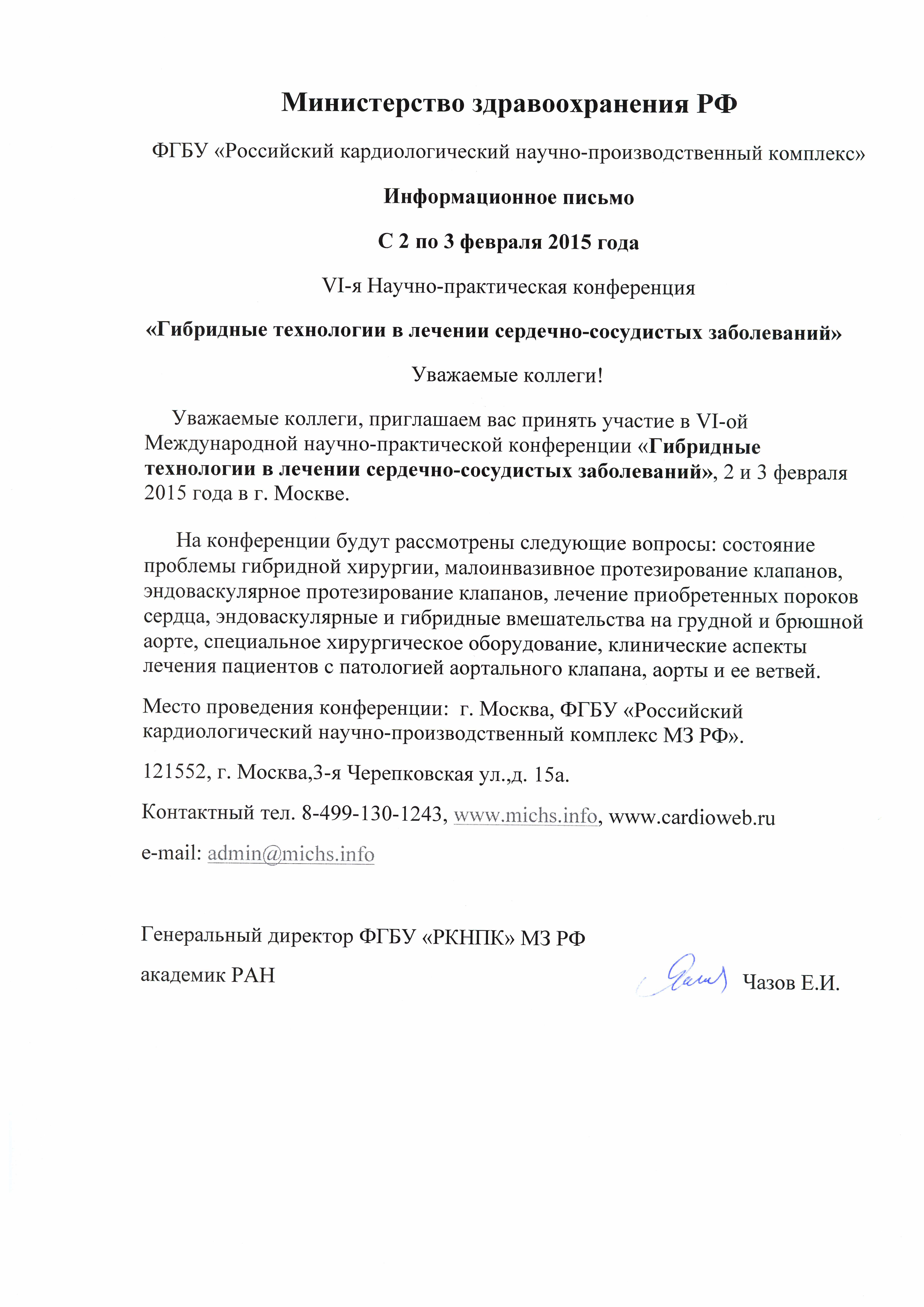 Мы рады пригласить Вас для участия в 6-ой ежегодной международной конференции "Гибридные технологии в лечении сердечно-сосудистых заболеваний" , которая будет проходить 2-3 февраля 2015 года в ФГБУ Российский Кардиологический Научно-Производственный Комплекс МЗ РФ, Москва, Российская Федерация.