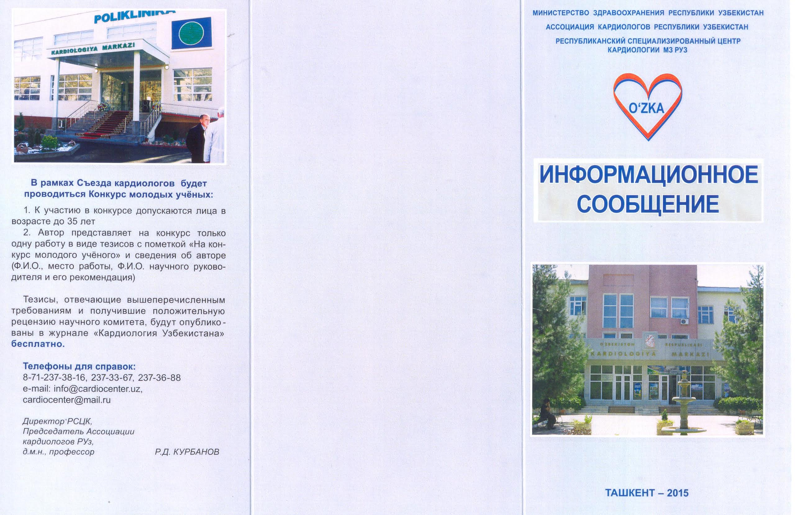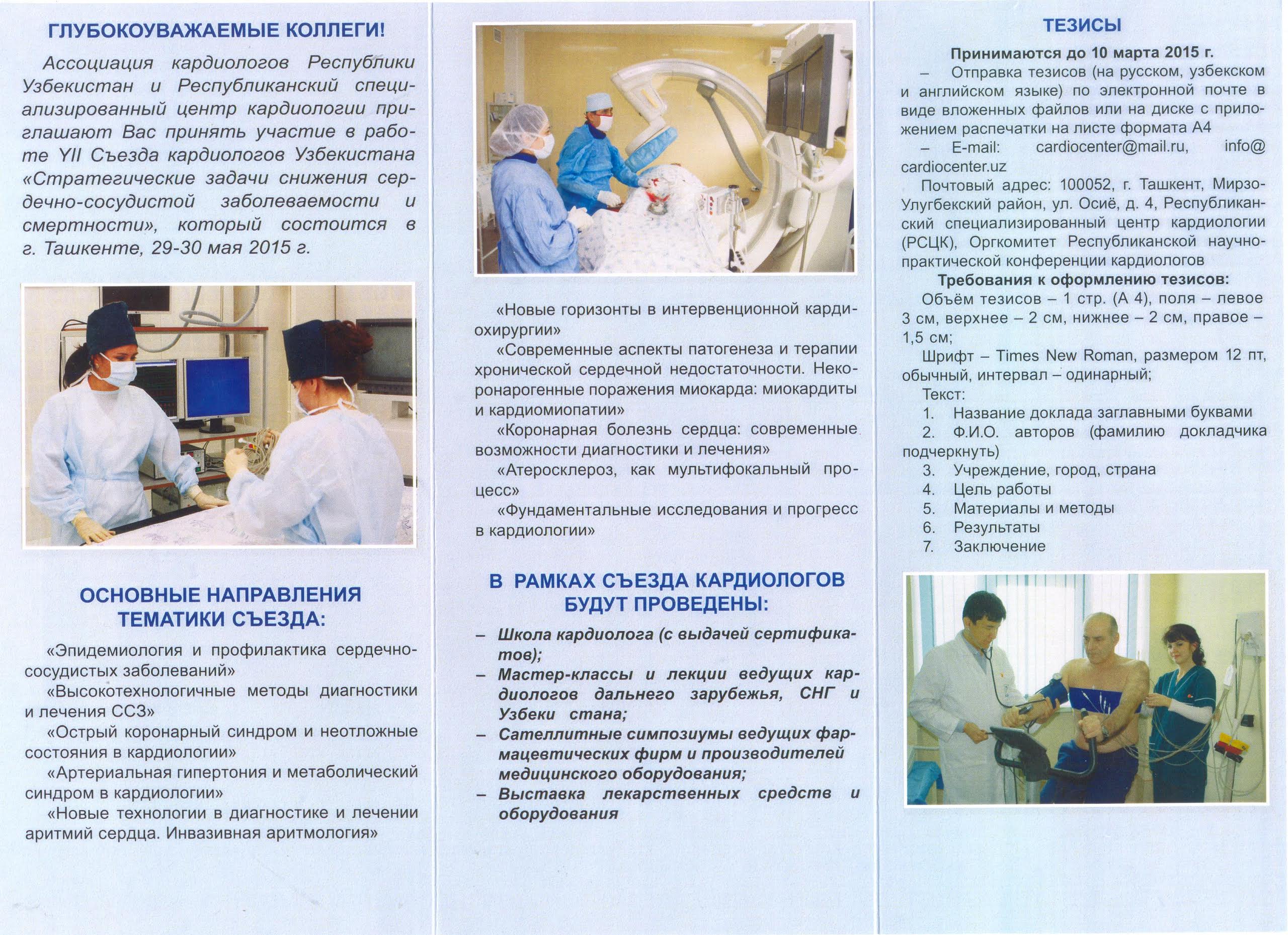 Ассоциация кардиологов Республики Узбекистан и Республиканский специализированный центр кардиологии приглашают Вас принять участие в работе YII Съезда кардиологов Узбекистана «Стратегические задачи снижения сердечно-сосудистой заболеваемости и смертности», который состоится в г. Ташкенте, 29-30 мая 2015 г.