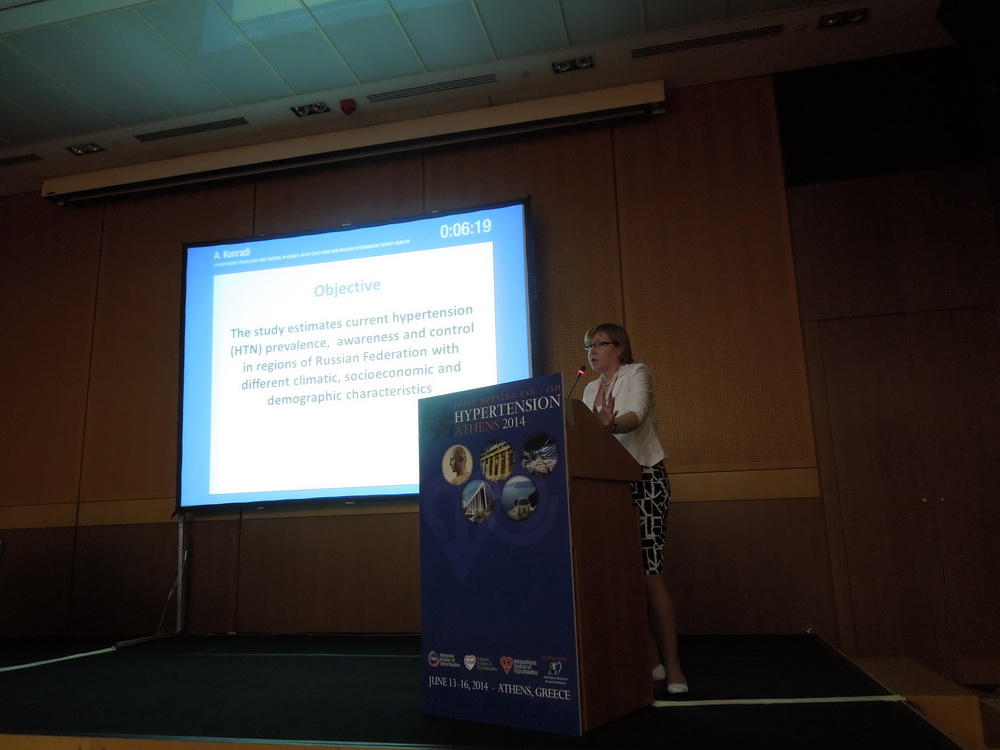 Также А.О. Конради выступила с устным докладом на тему «Hypertension prevalence and control in Russia: an up-date from new Russian epidemiology survey ESSE-RF» («Распространенность и контроль артериальной гипертензии в России: новые данные Российского эпидемиологического исследования ЭССЕ-РФ»). В докладе были представлены последние данные о ситуации в России, особенностях в регионах и предикторах адекватного контроля АГ в российской популяции, полученные в 12 регионах нашей страны в рамках исследования ЭССЕ-РФ.