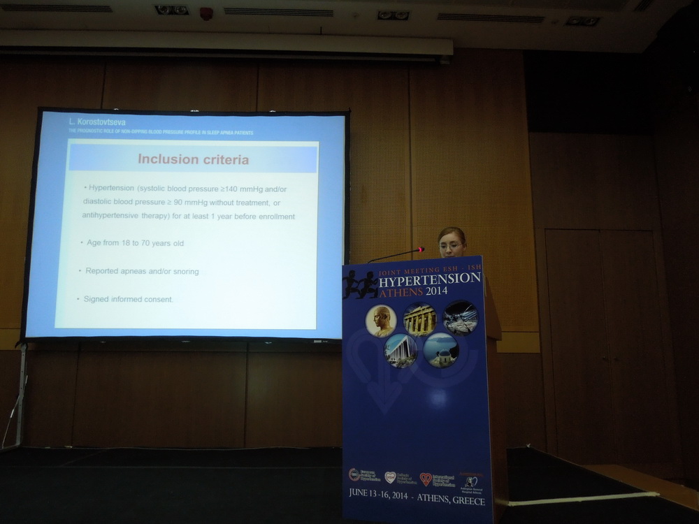 Сотрудница группы по сомнологии к.м.н. Коростовцева Людмила Сергеевна участвовала в конкурсной сессии на получение награды имени Остина Дойля (ISH Austin Doyle award) с устным докладом «The prognostic role of non-dipping blood pressure profile in sleep» («Прогностическая роль отсутствия адекватного снижения артериального давления в ночные часы у больных с синдромом обструктивного апноэ во время сна»).