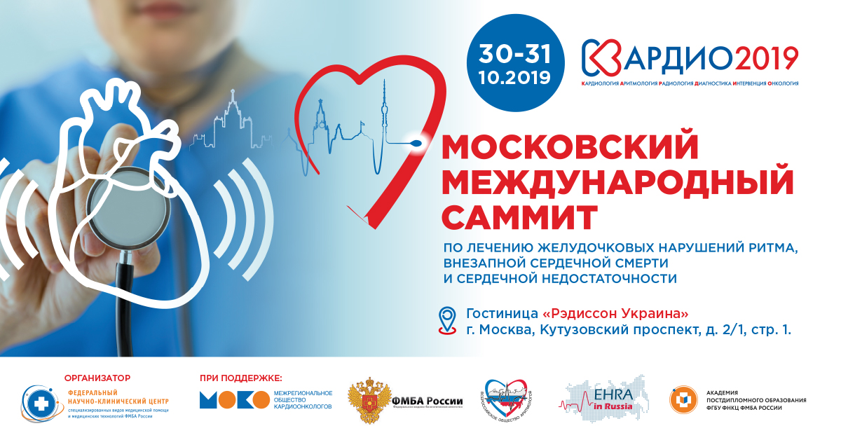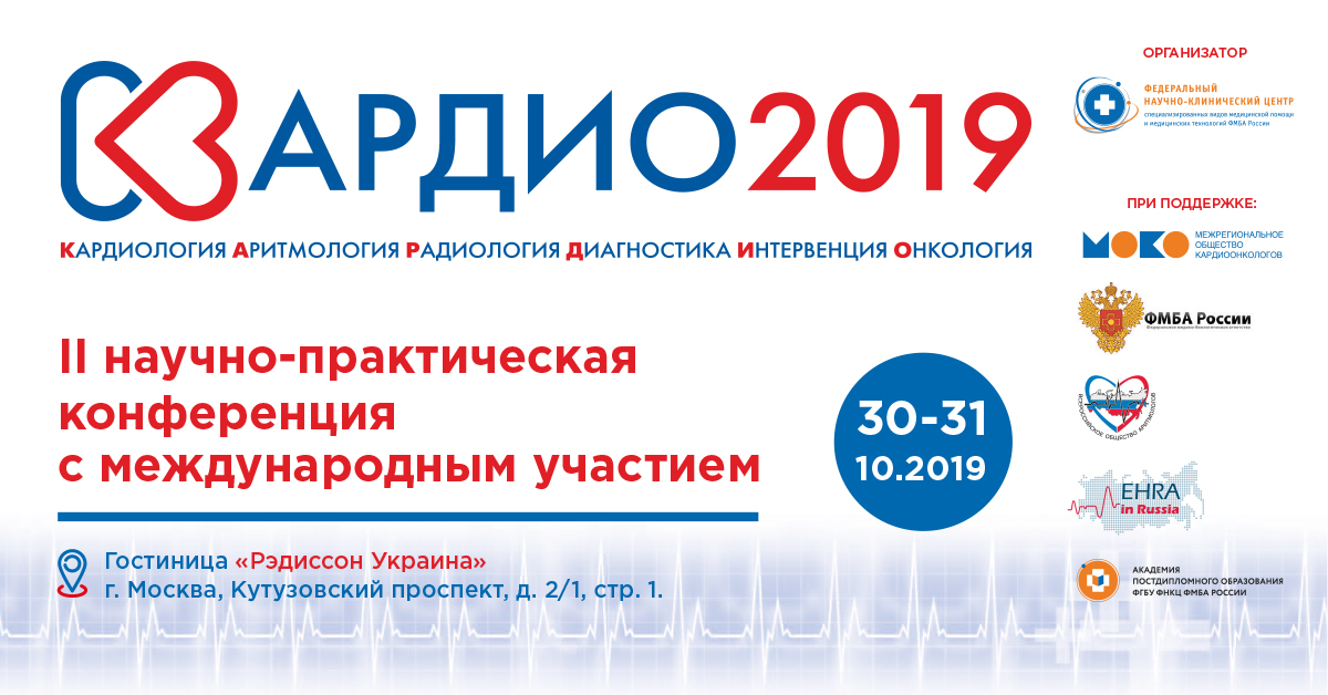 ФНКЦ ФМБА России совместно с Межрегиональным Обществом Кардиоонкологов, Всероссийским Научным Обществом Аритмологов и Европейской Ассоциацией Сердечного Ритма приглашают вас принять участие во II научно-практической конференции с международным участием КАРДИО-2019, которая состоится 30 – 31 октября в гостинице «Украина» по адресу: г. Москва, Кутузовский проспект, 2/1, стр.1.