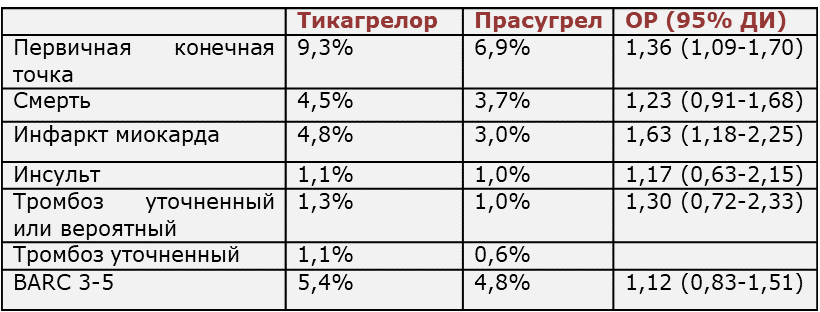 Показатели частоты тромбозов стента статистически значимо не различались между исследуемыми группами, но, тем не менее, этот показатель был количественно лучше в группе прасугрела (0,6%), чем в группе тикагрелора (1,1%).
