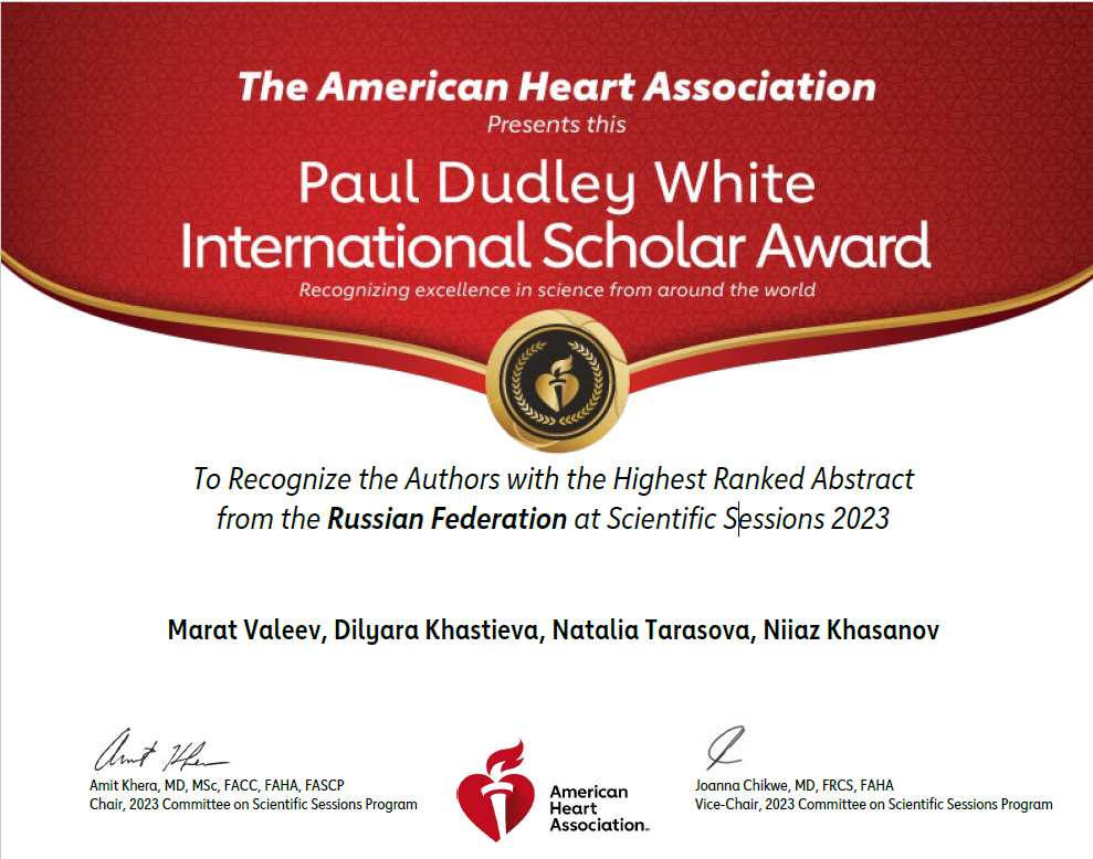 Научный коллектив Казанского государственного медицинского университета в составе врача-кардиолога М.Х. Валеева, ассистентов кафедры пропедевтики внутренних болезней имени профессора С.С.Зимницкого Д.Р.Хастиевой и Н.А.Тарасовой, заведующего кафедрой профессора Н.Р.Хасанова был удостоен награды Пола Уайта (Paul Dudley White International Scholar Award) на конференции Американской ассоциации сердца (AHA Scientific Session 2023), которая проходила 11-13 ноября в г. Филадельфия, США. Постерный доклад «Association of Iron Deficiency With the Recurrence of Atrial Fibrillation After Pharmacological Cardioversion», посвященный вопросу влияния дефицита железа на развитие симптомных рецидивов фибрилляции предсердий после фармакологической кардиоверсии амиодароном, был признан научным комитетом Американской ассоциации сердца лучшим из России в 2023 году. По результатам наблюдения в течение 1 года после кардиоверсии за пациентами с неклапанной пароксизмальной фибрилляцией предсердий, было показано повышение риска развития рецидивов аритмии в 2,6 раза у пациентов с дефицитом железа в сравнении с пациентами с нормальным статусом железа.