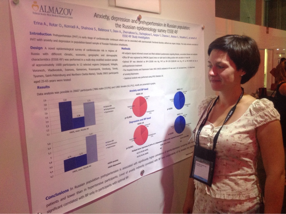 Анастасия Ерина представляет свой постер об уровне тревожности и депрессии ( шкала HADS) у обследованных с пригипертензией в Российской популяции. По данным результатов эпидемиологического исследования ЭССЕ-РФ.