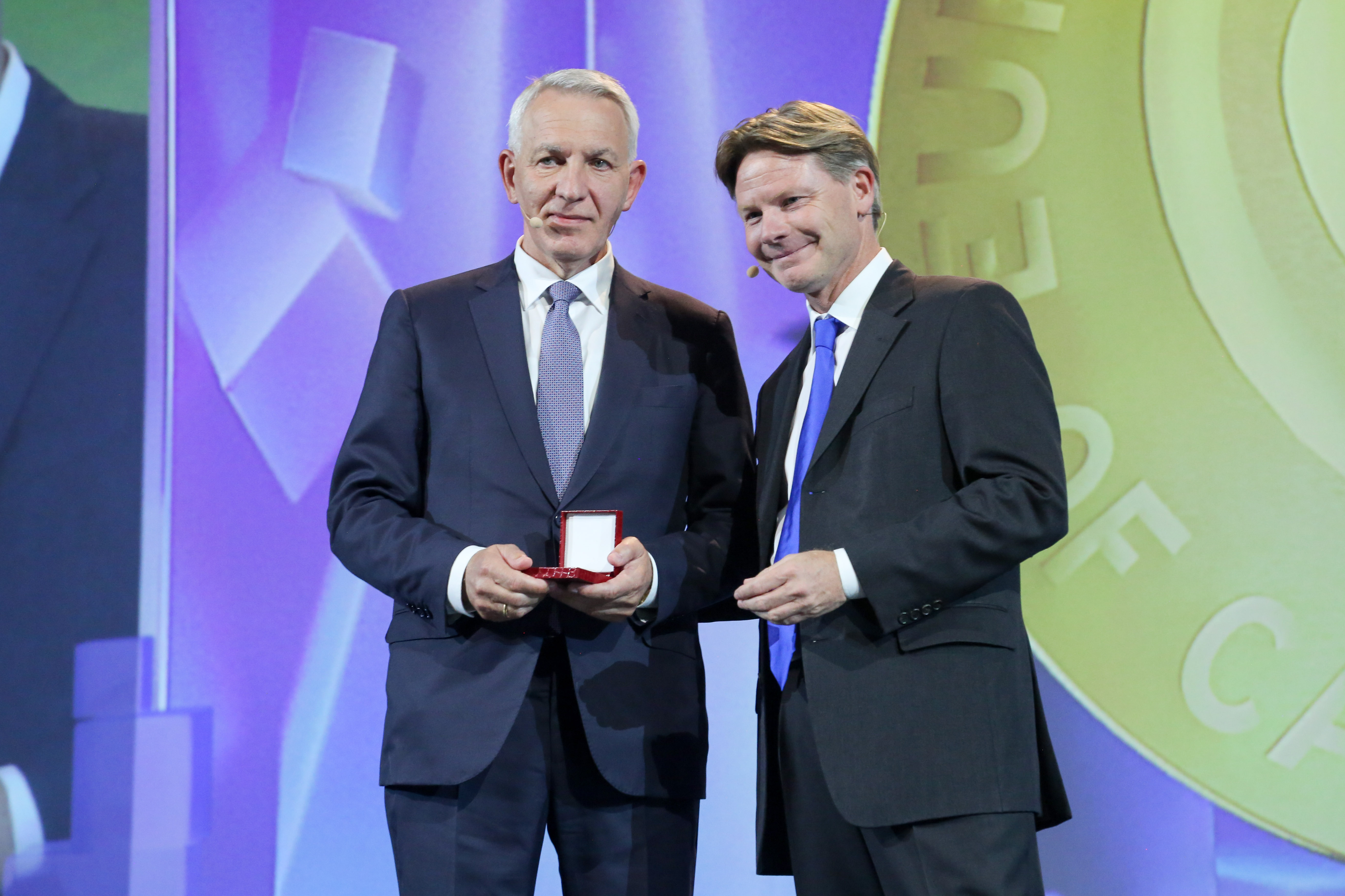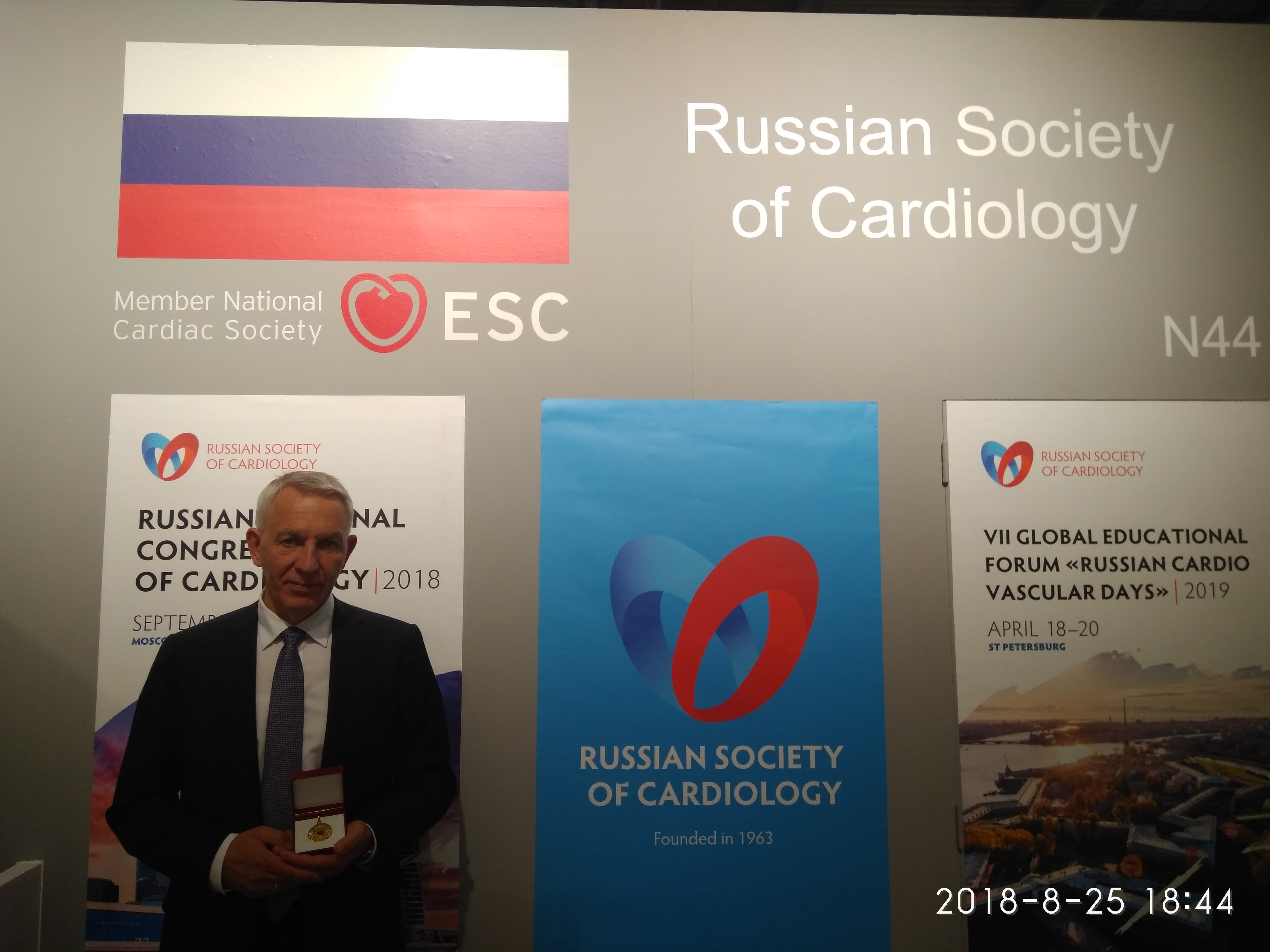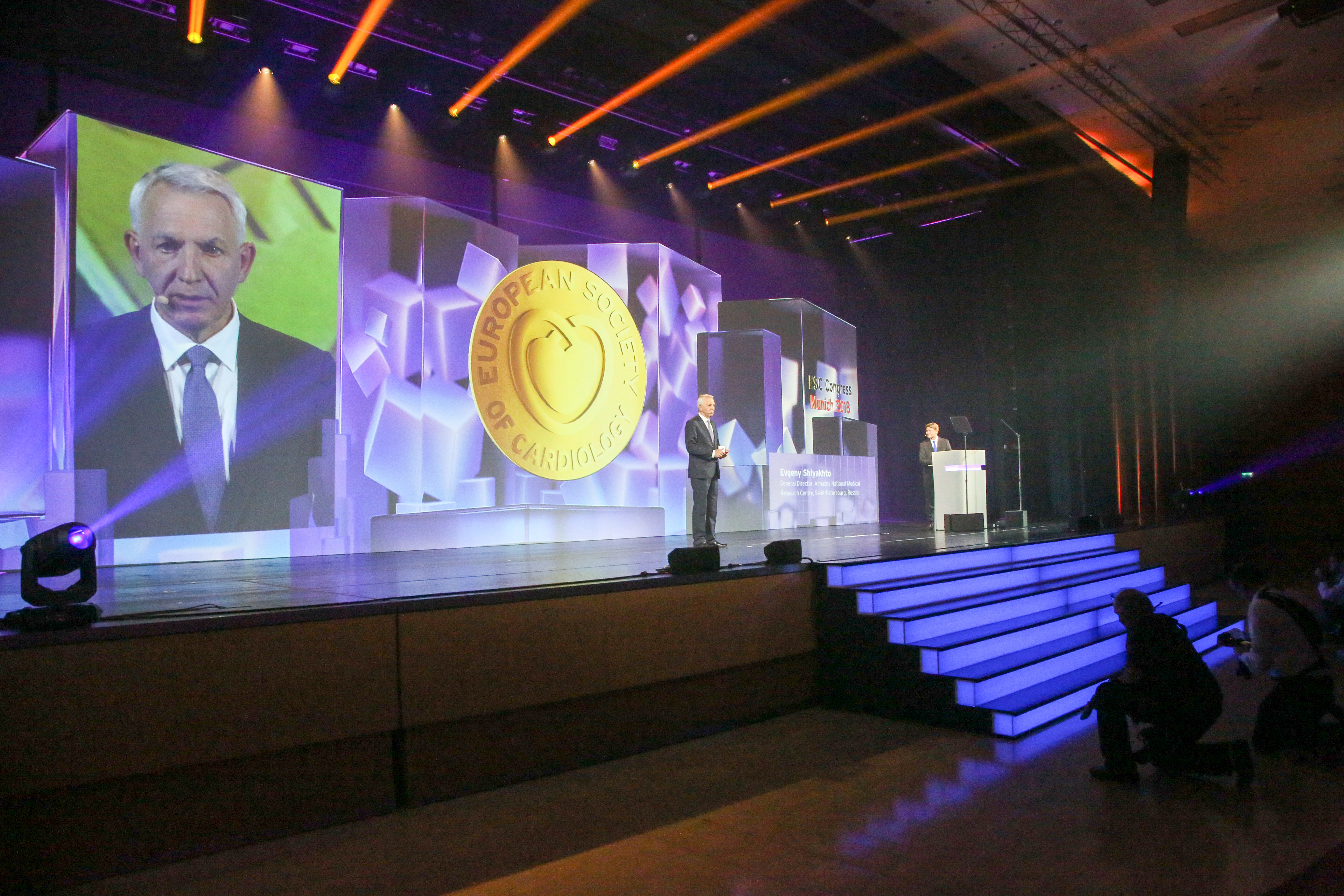 В рамках церемонии открытия конгресса Европейского кардиологического общества президент ESC проф. Е.Бакс вручил президенту РКО, академику РАН Евгению Владимировичу Шляхто золотую медаль - высшую награду европейского кардиологического сообщества.