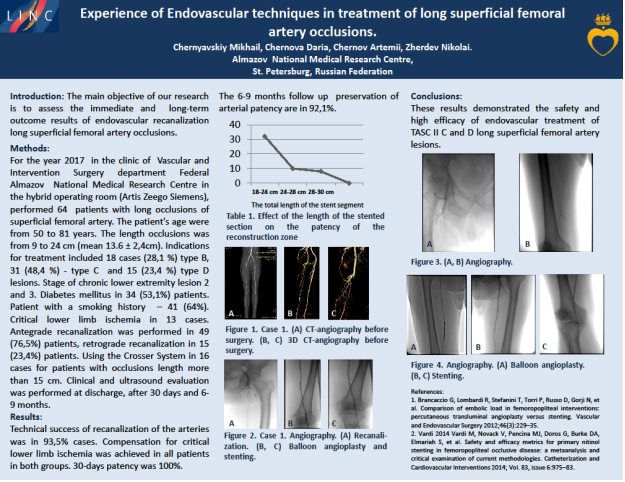 Рандомизированное одноцентровое исследование лечения пациентов с протяженными окклюзиями поверхностной бедренной артерии. Чернова Д.В., Чернявский М.А., Чернов А.В., Медведь М.С., Артюшин Б.С. // Ангиология и сосудистая хирургия. Матер. XXXIV междунар. конф. Росс. общества ангиологов и сосуд. хирургов «Перспективы развития сосудистой хирургии в стране и ее регионах», Ярославль. – 2018. – Т. 24, № 3 (приложение). – С. 525-527.