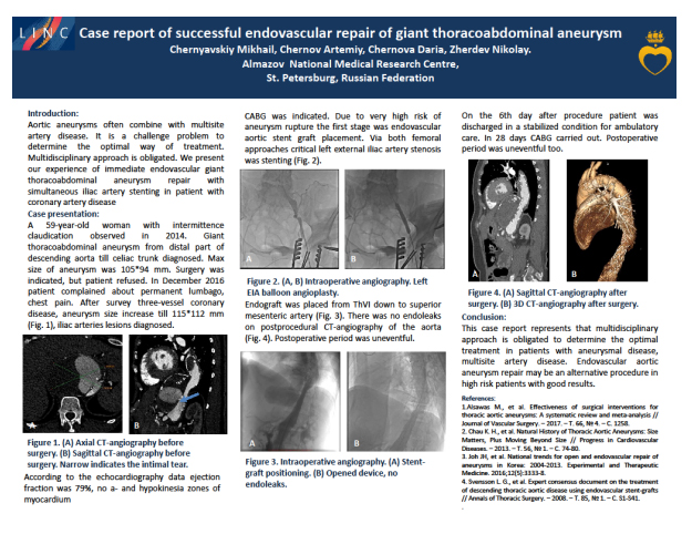 Коронароангиография перед эндоваскулярным лечением аневризмы аорты у пациентов высокого кардиального риска. Чернявский М.А., Кудаев Ю.А., Чернов А.В., Артюшин Б.С. // Кардиоваскулярная терапия и профилактика. – 2018. – Т. 17, №S. –С. 30а.
