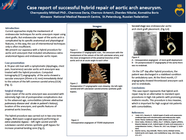 Непосредственные и отдаленные результаты гибридного хирургического лечения пациентов с аневризмами дуги аорты. Жердев Н.Н., Чернов А.В., Чернова Д.В., Артюшин Б.С. // Тезисы Всеросс. молодежн. мед. конф. с междунар. участием «Алмазовские чтения – 2018» / СПб. – 2018. – С. 542.