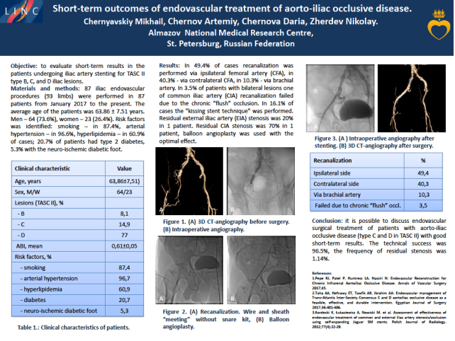 Результаты эндоваскулярного лечения окклюзий инфраренального отдела аорты. Жердев Н.Н., Чернявский М.А., Чернова Д.В., Чернов А.В., Артюшин Б.С. // Ангиология и сосудистая хирургия. Матер. XXXIV междунар. конф. Росс. общества ангиологов и сосуд. хирургов «Перспективы развития сосудистой хирургии в стране и ее регионах», Ярославль. – 2018. – Т. 24, № 3 (приложение). – С. 151-152.